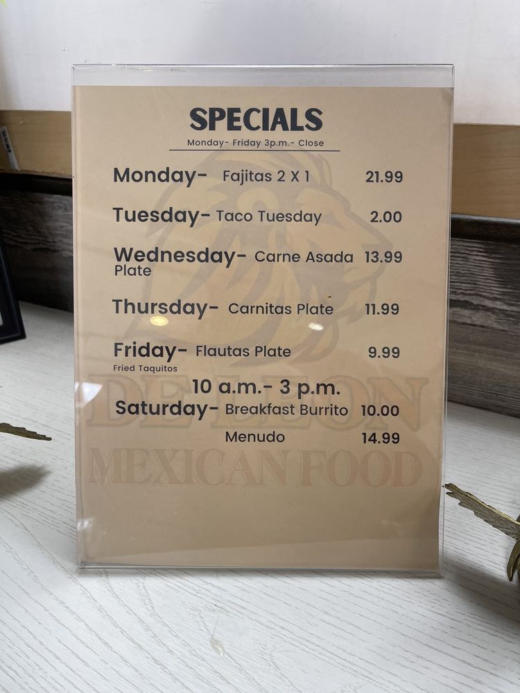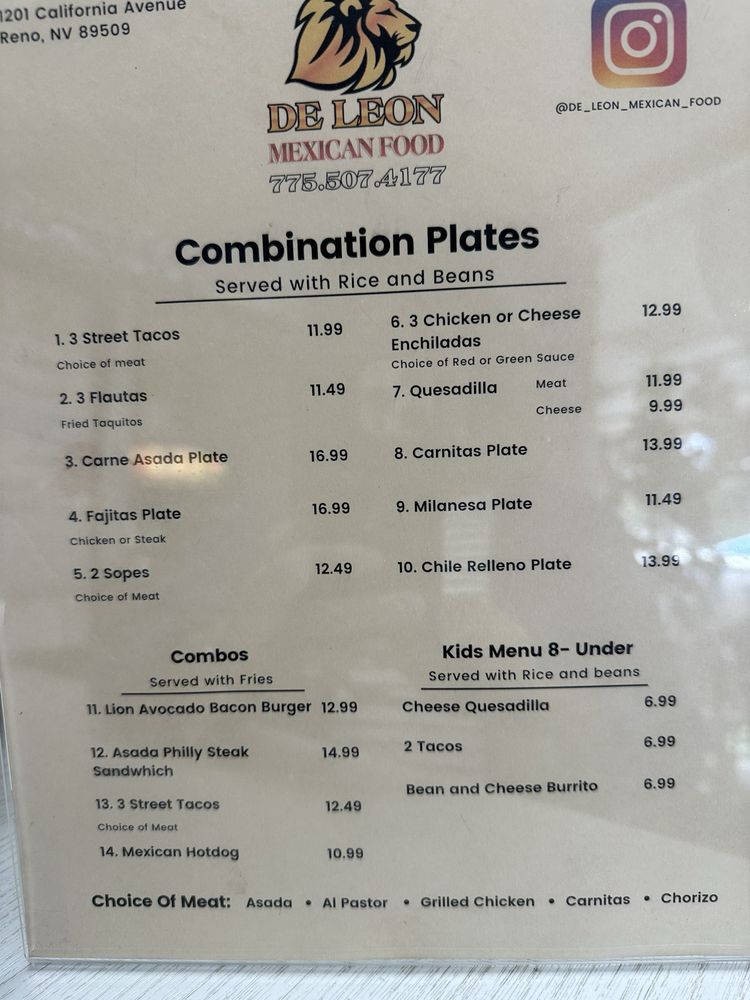 DE LEON MEXICAN FOOD offers a range of Mexican dishes in a casual setting. Their menu includes flavorful tacos like Al Pastor and Asada, as well as mouth-watering options like Cubana and Milanesa Tortas. For those looking for variety, they also have Combination Plates like Three Flautas with a choice of chicken or beef. The restaurant provides various amenities such as delivery, takeout, reservations, and catering options. Located in Reno, NV, DE LEON MEXICAN FOOD is a great spot for lunch or dinner, with ample parking and wheelchair accessibility. The relaxed atmosphere, happy hour specials, and dog-friendly policy make it a welcoming choice for groups or solo diners. The authentic taste and generous portions are sure to satisfy any Mexican food enthusiast.